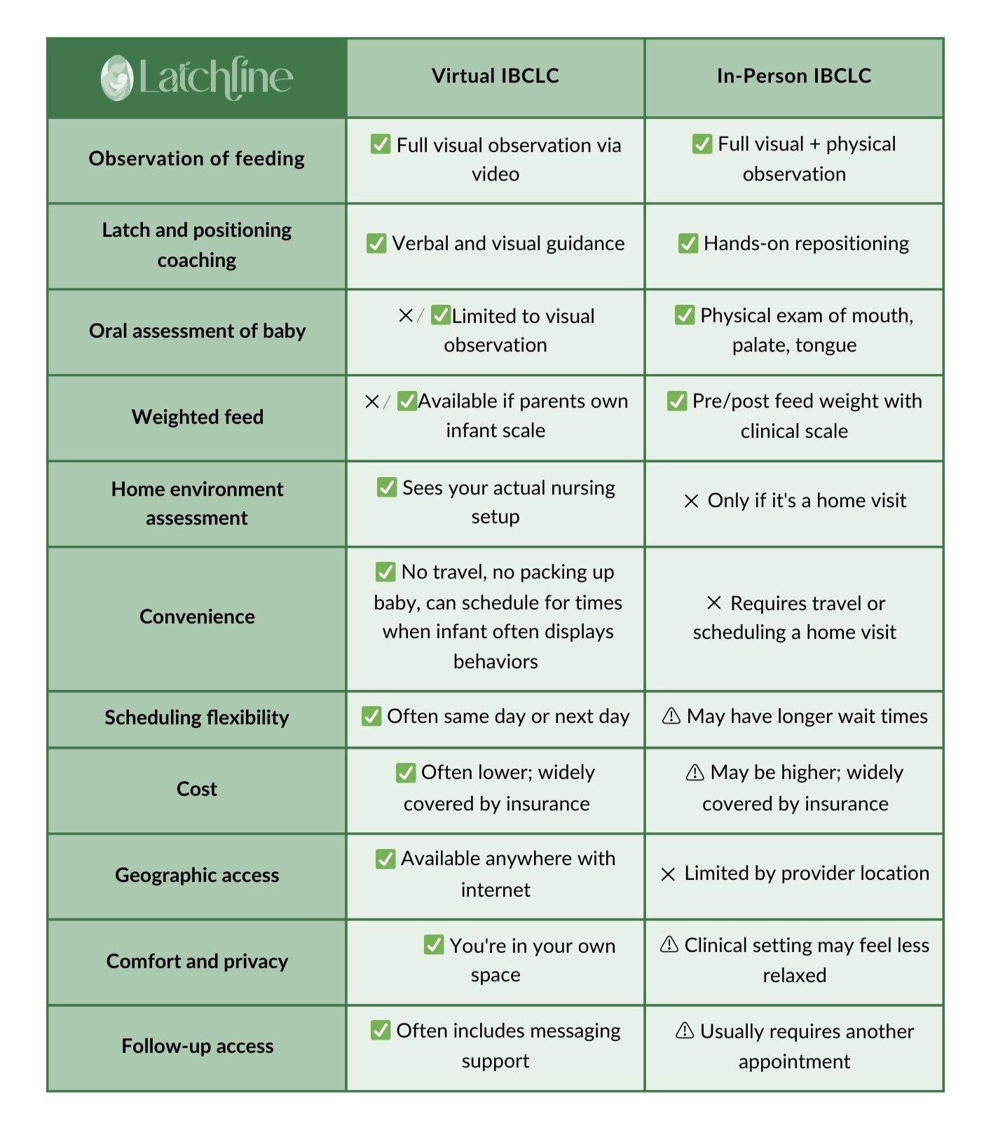 In-person visits are most valuable when a physical oral assessment is needed (suspected tongue tie), when a weighted feed is required to measure milk transfer, or for complex medical situations. Your virtual IBCLC at LatchLine will always recommend in-person evaluation if clinically indicated.